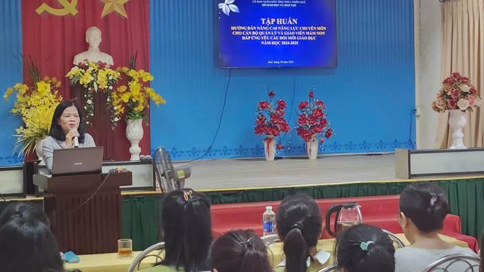 Thực hiện kế hoạch năm học 2024-2025 đối với cấp học mầm non, ngày 02 và 03 tháng 10 năm 2024, tại trường mầm non I, thành phố Huế, Sở Giáo dục và Đào tạo tổ chức tập huấn bồi dưỡng nâng cao năng lực chuyên môn cho cán bộ quản lý và giáo viên mầm non đáp ứng yêu cầu đổi mới giáo dục trong giai đoạn mới.